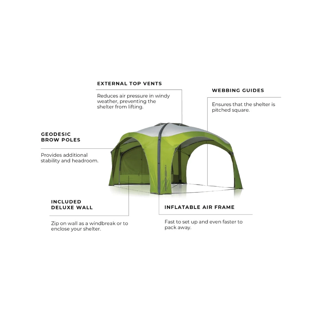 The Aerobase 3 air shelter also mates well with our Evo & Pro series tents using an Evo or Pro Link. The shelter comes with one deluxe wall included for additional shade or to use as a windbreak.
