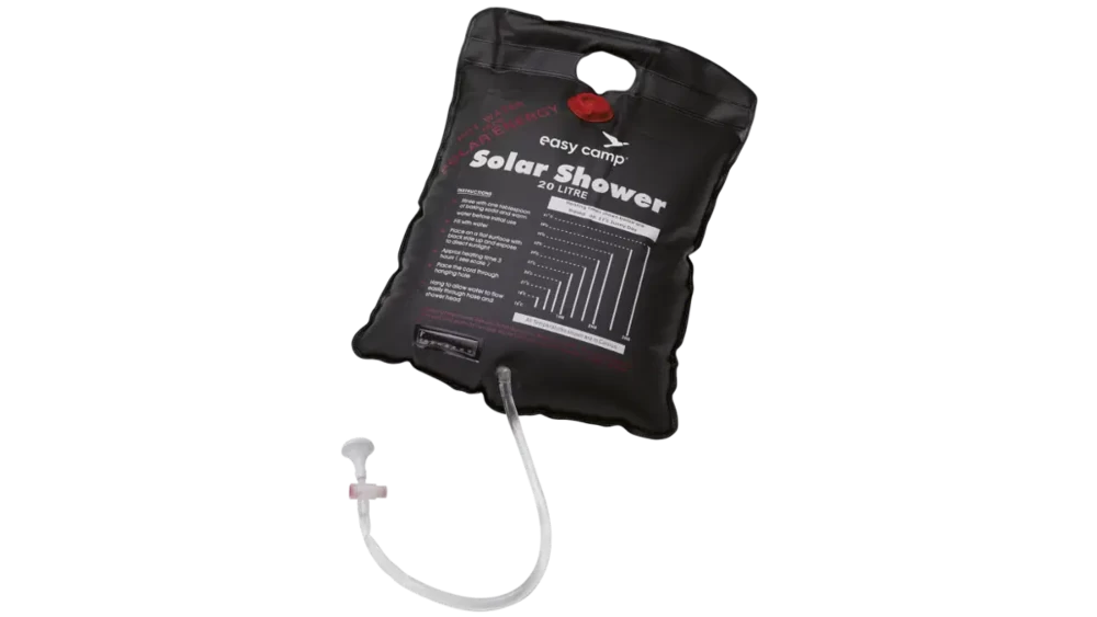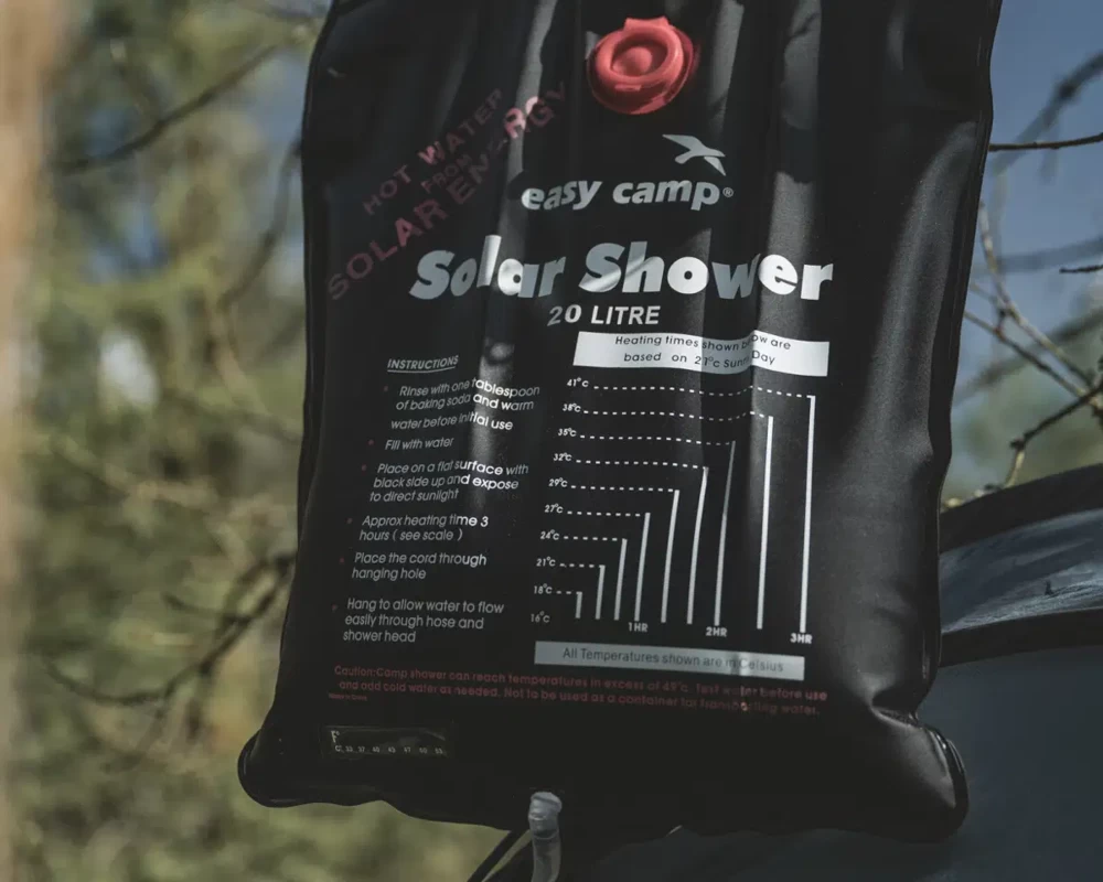 The Solar Shower heats water for free using the sun. It provides a convenient way to take a quick shower or clean dishes and gear outdoors. The built-in thermometer makes it easy to monitor the water temperature.