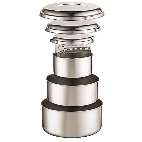 - Includes: (1) 1L pot, (1) 2L pot, (1) 3L pot, (3) lids/plates, (1) PanHandlerâ„¢ pot handle, and stuff sack.