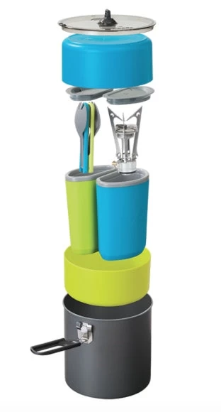 With the original and legendary PocketRocket® stove at its foundation, the PocketRocket Stove Kit has everything you need to cook-and-eat for two in the backcountry. At its core, the simple, rugged stove delivers fast boil times at camp for quick meals after a long day. Two color-matching dish sets include our ultralight Insulated Mugs, DeepDish™ Bowls and folding sporks. Everything nests inside the 2 liter aluminum pot to create an impressively lightweight and space-efficient kit for backpacking duos.