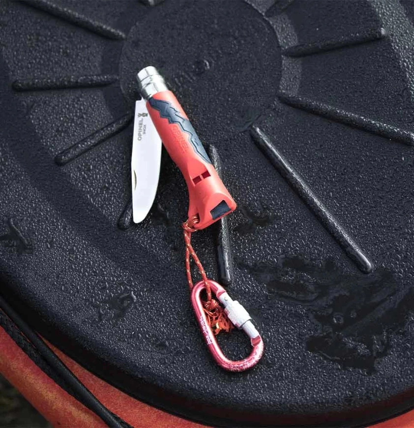 The handle withstands shocks, water and high temperatures. It is equipped with a whistle. The stainless steel blade is solid and sharp. The safety ring blocks the blade in open position and closed position.