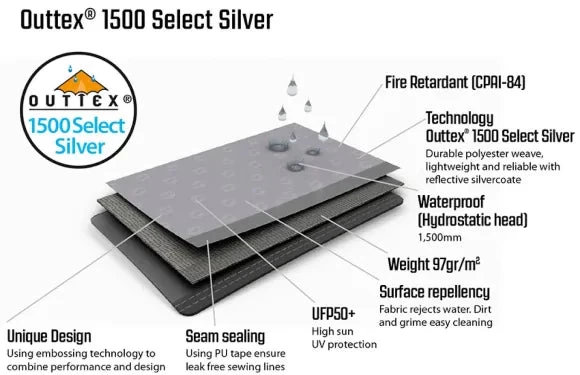 Outtex® 1500 Select Silver is a tough, durable and fire-retardant PU-coated 100 per cent polyester fabric created to balance weight and strength with the ability to resist the demands of regular caravan life. It provides a 1,500mm hydrostatic head water
