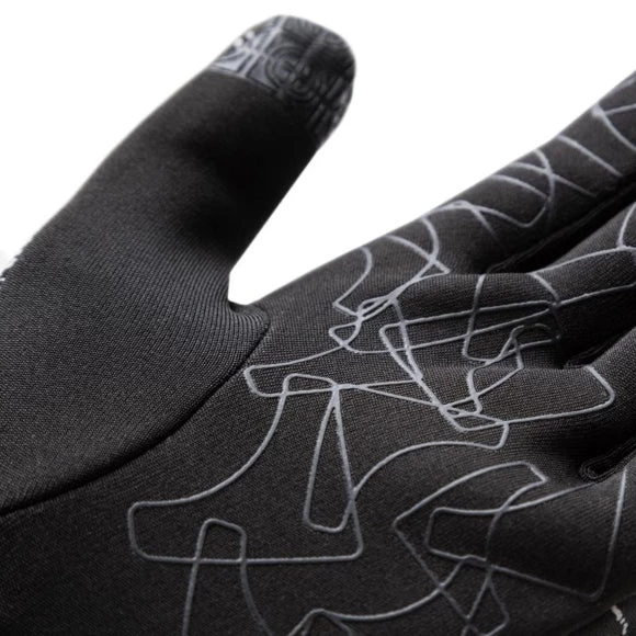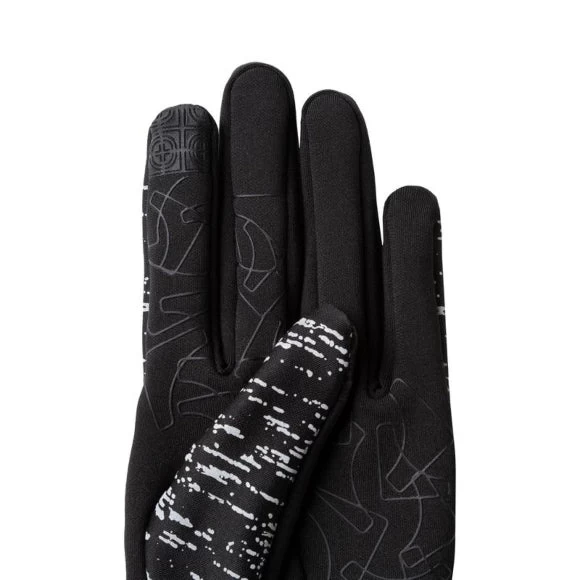 Stretch glove with reflective print at back and thumb for safety in low light conditions and brushed inside for warmth.