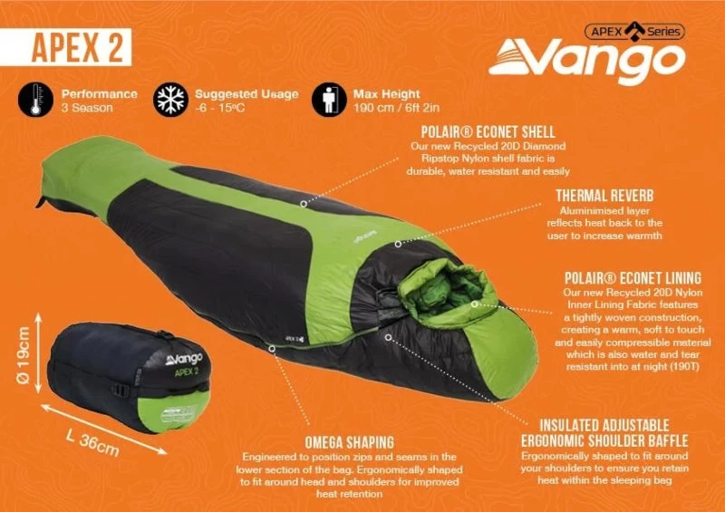 The Apex 2 Sleeping bag is part of our Apex Range and has been designed with our most innovative, environmentally friendly fabrics to date. It features Polair® EcoNet Lining made from recycled fishing nets and EcoLoft® insulation, a recycled synthetic, engineered to imitate the characteristics of real down filling. This Omega shaped bag has been ergonomically tailored around the head and shoulders to retain heat and its unique Thermal Reverb causes heat to reflect back onto the body making this bag the very pinnacle of thermal efficiency.