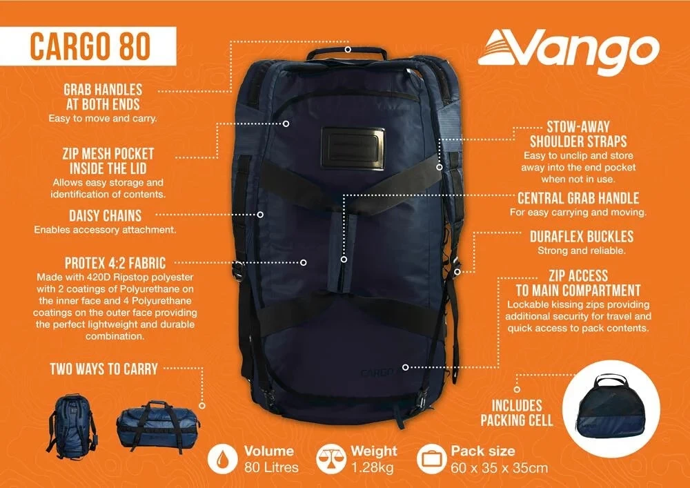 The Cargo 80 bag is a robust travel bag designed for all your travel needs. Perfectly sized for short breaks or longer trip on the road with plenty of space for all your gear. The convertible design allows you to clip on backpack straps or tuck them away to use the comfy carry handle.