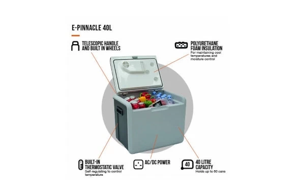 The Vango E-Pinnacle 40 Litre Mains and 12V Electric Coolbox can be powered either from AC -230V mains or by a DC – 12V in-car socket. The coolbox is able to cool up to 16°C below the ambient temperature ensuring that your food and drink supplies are kept cool even on a warm day. Telescopic handle and sturdy wheels make it easy to manoeuvre. Two removable dividers for food and beverage storage makes it the perfect coolbox for all occasions.